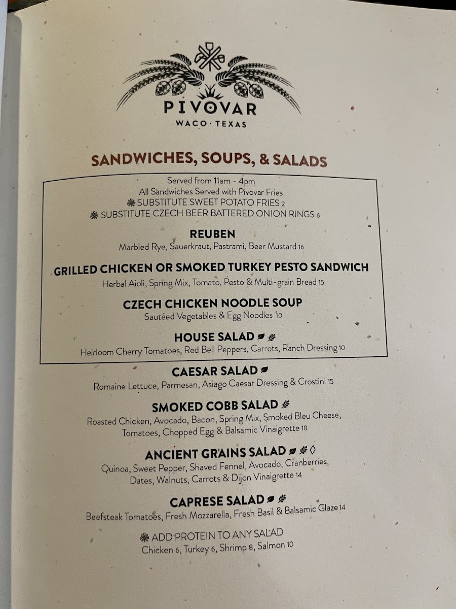 Located in the heart of Waco, Texas, Pivovar offers a delightful fusion of Czech cuisine and craft brewery favorites. The menu begins with tempting starters such as the Beer Battered Onion Rings and Czexan Potted Beer Cheese, perfect for sharing. For soup and salad lovers, the Cobb Salad and Pivo House Salad provide fresh, satisfying options.